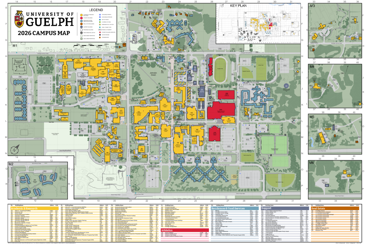 The main campus building lists can be viewed according to building number, acronym (ID) and name. Also included is the corresponding municipal address and the year the buildings were built.